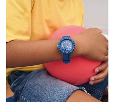 À chaque fois que votre petit bout lira l’heure sur cette montre suisse, il pensera aux magnifiques aurores boréales ! Avec son boîtier en plastique bleu foncé uni et sa lunette rotative à imprimé vert, la Solo Dark Blue illumine notre nouvelle collection.
