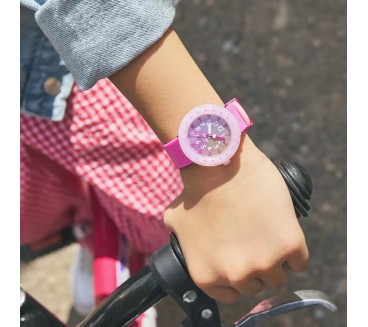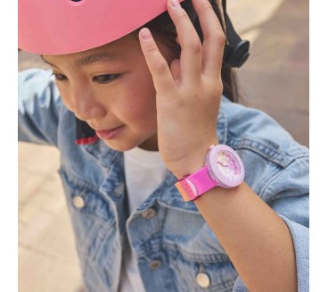 La Flik Flak Fuze in Pink ZFCSP130 est une montre ludique et attrayante pour enfants, issue de la collection Classroom Creations. Elle combine un bracelet multicolore fait à la main avec un effet nacré sur le cadran, idéale pour aider les enfants à apprendre l'heure de manière amusante. Robuste et pratique, cette montre intègre un boîtier monobloc en polymère léger, d’un diamètre de 36,7 mm et d’une épaisseur de 10,2 mm, avec une lunette rotative texturée permettant d'introduire les notions d’immersion temporelle. Elle est animée par un mouvement à quartz suisse précis, protégée par un verre plat en polymère, et étanche à 3 ATM, suffisant pour résister aux éclaboussures et même à la nage en surface.