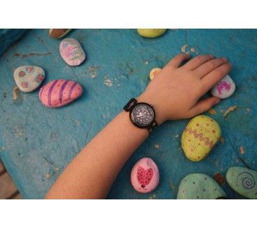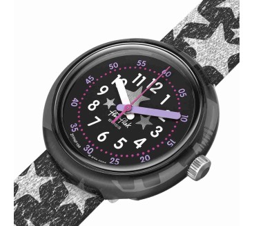 La montre Flik Flak Starry Night (réf. FPNP168) est conçue spécialement pour les enfants : elle combine un design ludique, écologique et éducatif. Son boîtier en matériau biosourcé noir enveloppe un cadran évoquant un ciel étoilé, décoré de motifs métalliques en forme d’étoiles. Le bracelet multicolore en PET recyclé ajoute une touche fun et durable à ce modèle, parfait pour un usage quotidien actif. Animée par un mouvement quartz suisse, la Starry Night garantit précision et fiabilité. Elle est dotée d’une étanchéité de 3 bar (~30 m) adaptée aux éclaboussures et aux jeux d’enfants. En choisissant cette montre, vous optez pour un accessoire Swiss Made, amusant, résistant et respectueux de l’environnement — idéal comme premier vrai garde-temps pour un enfant curieux de découvrir l’heure.