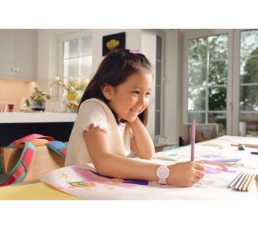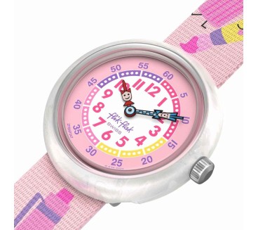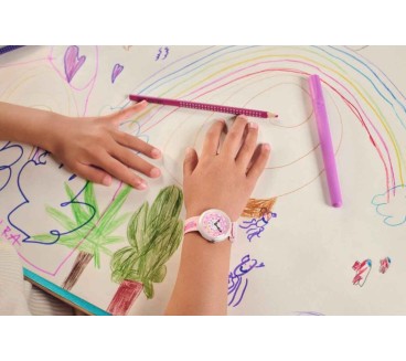 La montre Flik Flak In My Bag (réf. ZFBNP247) est pensée spécialement pour les enfants : son boîtier d’environ 31,85 mm en matériau biosourcé rose apporte douceur et style adapté aux plus jeunes. Le cadran blanc met en valeur des chiffres clairs et colorés, facilitant l’apprentissage de la lecture de l’heure. Le bracelet en textile multicolore ajoute une touche ludique et confortable pour un port quotidien. Animée par un mouvement quartz suisse, cette montre combine fiabilité et longévité. Elle affiche une étanchéité de 3 bar (~30 m), adaptée aux éclaboussures liées à la vie active des enfants.