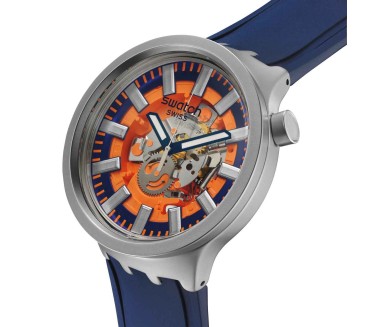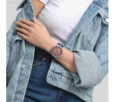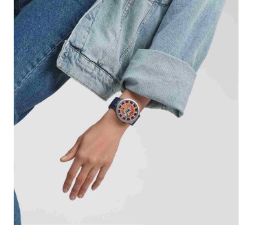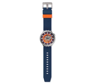 Cette montre oversize a un cadran ouvert bleu foncé à imprimé argenté et orange ainsi qu’une lunette et un boîtier en acier inoxydable sablé. Elle a des aiguilles des heures et des minutes bleu foncé qui brillent dans l’obscurité et une aiguille des secondes blanche. Son bracelet bleu foncé à passants bleu foncé et orange et sa demi-boucle en acier inoxydable complètent le look de cette montre.