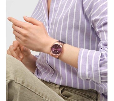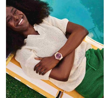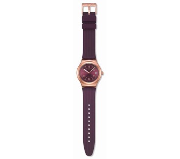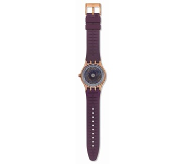 La Swatch Burgundy Story YIG401 marie élégance moderne et savoir-faire suisse. Son cadran bordeaux soleillé est sublimé par des index légèrement rosés et des chiffres imprimés avec subtilité. Le boîtier tonneau de 42 mm en acier inoxydable plaqué or rose laisse apparaître le mouvement SISTEM51 automatique à remontage automatique via un fond transparent. Les aiguilles dorées luminescentes et la trotteuse brune assurent une lecture claire, tandis que la fenêtre date à 3 h ajoute un côté pratique. Le tout est monté sur un bracelet silicone bordeaux texturé avec boucle alternée assortie pour un design harmonieux. Conçue pour résister aux éclaboussures grâce à son étanchéité 3 ATM, la Burgundy Story devient un accessoire distinctif, adapté à un usage quotidien et affirmé.