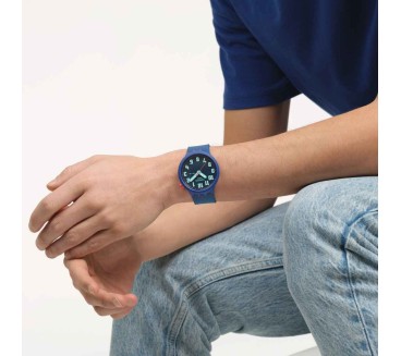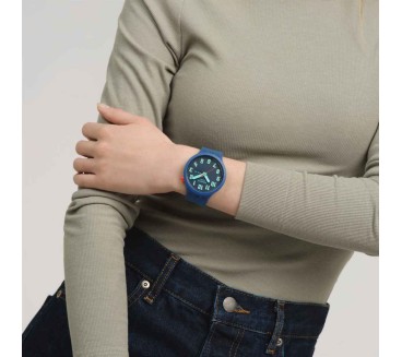 La Swatch Essentially Bold SB01N700 est une montre unisexe au design audacieux et contemporain. Son boîtier en plastique bleu mat de 47 mm abrite un cadran bleu foncé orné de chiffres arabes turquoise en 3D, d'un chemin de fer des minutes imprimé en turquoise et rouge, ainsi que d'un indicateur jour-date à 3 heures. Les aiguilles des heures et des minutes sont luminescentes, tandis que la trotteuse rouge ajoute une touche dynamique. Le bracelet en silicone bleu et turquoise dégradé assure confort et durabilité. Alimentée par un mouvement à quartz suisse, cette montre est résistante aux éclaboussures (3 ATM), idéale pour un usage quotidien.