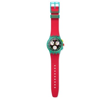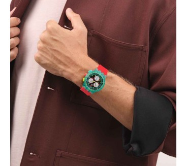 La Swatch Neon Emerald Chrono (SUSG409) combine audace et performance. Son boîtier vert transparent de 42 mm met en valeur un cadran noir multicolore avec sous-cadrans chronographe et aiguilles luminescentes. Le bracelet en silicone rouge texturé offre confort et résistance pour un usage quotidien. Équipée d’un mouvement à quartz suisse, cette montre assure précision et fiabilité, tandis que son chronographe intégré permet de mesurer le temps avec style. Le verre acrylique robuste protège le cadran, et l’étanchéité 3 bar (≈ 30 m) garantit une utilisation sans souci face aux éclaboussures. Idéale pour les amateurs de montres unisexe, colorées et originales, la Neon Emerald Chrono SUSG409 allie design rétro‑néon et modernité, parfaite pour affirmer votre personnalité dans toutes les situations.