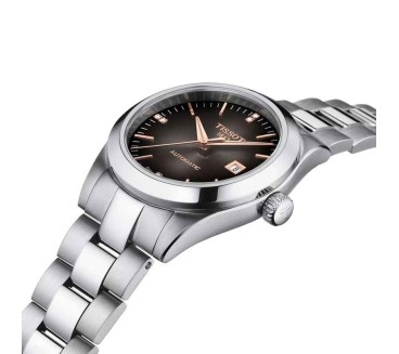 La Tissot T-My Lady Automatique T1320071106601 est une montre féminine mêlant finesse, sophistication et technique horlogère suisse. Son boîtier en acier inoxydable 316L d’un diamètre de 29,3 mm arbore un cadran anthracite dégradé orné de 8 diamants comme index, pour un éclat discret. Elle est animée par un mouvement automatique enrichi d’un spiral Nivachron™ anti-magnétique, avec une réserve de marche de 48 heures et un fond transparent qui révèle le mécanisme. Grâce à ses bracelets interchangeables à dégagement rapide, vous pouvez adapter la montre à votre style en un clic. Étanche à 10 bar (100 m / 330 ft), elle accompagne aussi bien les journées urbaines que les escapades aquatiques.